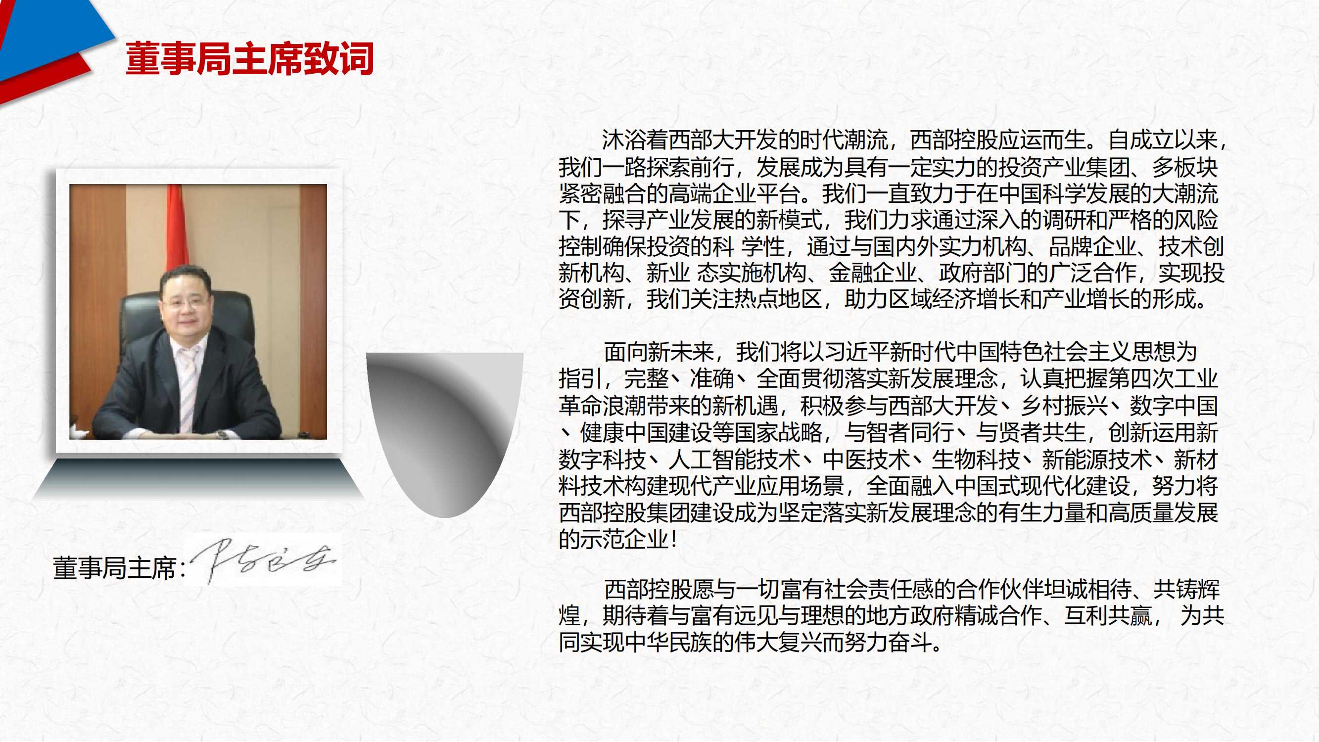 面向新未来,我们将以习近平新时代中国特色社会主义思想为指引,完整丶准确丶全面贯彻落实新发展理念,认真把握第四次工业革命浪潮带来的新机遇,积极参与西部大开发丶乡村振兴丶数字中国丶健康中国建设等国家战略,与智者同行丶与贤者共生,创新运用新数字科技丶人工智能技术丶中医技术丶生物科技丶新能源技术丶新材料技术构建现代产业应用场景,全面融入中国式现代化建设,努力将西部控股集团建设成为坚定落实新发展理念的有生力量和高质量发展的示范企业!